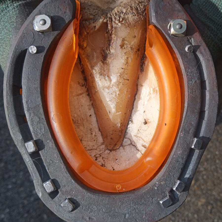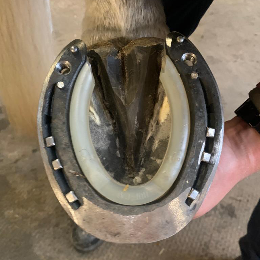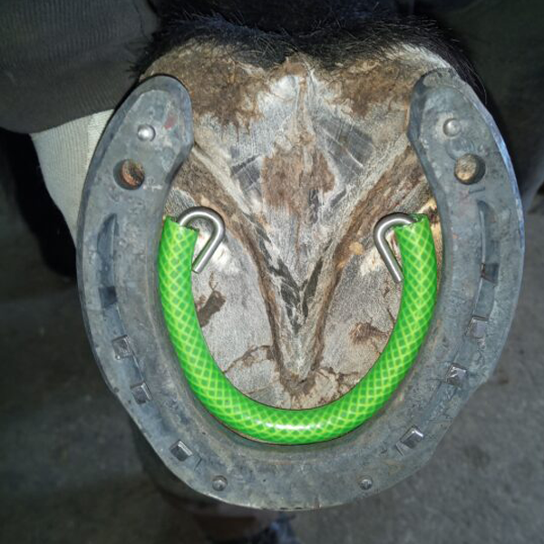 In unserem Betrieb verwenden wir meistens die Hufgrip. Die sind aus strapazierfestem Gummi gefertigt. Sie halten in der Regel eine Saison aus, und können dadurch zweimal verwendet werden. Die Hufgrip werden mit zwei Alu-Nieten am Hufeisenende zusätzlich befestigt, so das sie nicht an den Eisenenden hervorragen. Wir haben die gängigsten Farben zur Auswahl und im Fahrzeug griffbereit. Die Hufgrip können auch ausserhalb des Beschlags Rhythmus montiert werden.