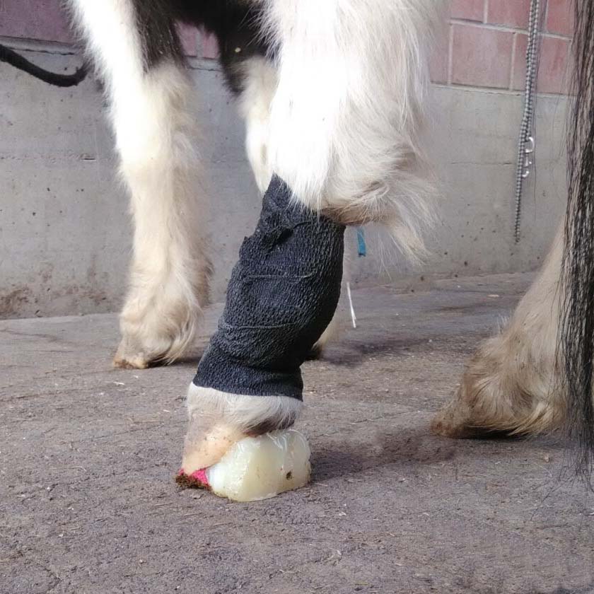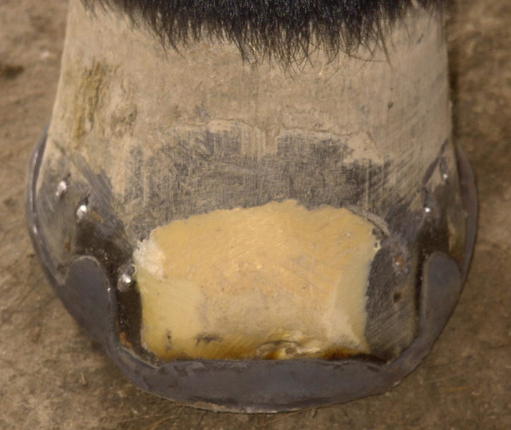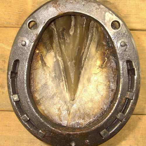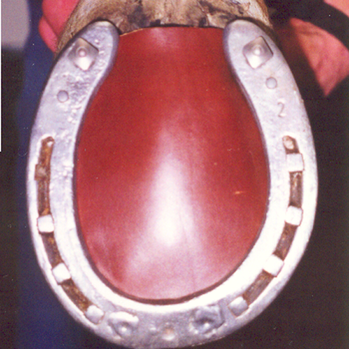 Weiter hat die Ledersohle mit der entsprechenden Polsterung schlagdämpfende Eigenschaften. Sohlen sind in verschiedenen Materialien (Leder, Plastik, Gummi), Formen (flache, keilförmige) und Grössen (Pony, Reitpferde) erhältlich. Die Polsterung kann aus Silikon, Hebaform, Watte, Hanf usw. bestehen. Eine Sohle muss immer unterlegt werden, um das Eindringen von Fremdkörpern unter die Sohle zu vermeiden. Die Wahl des Materials erfolgt fallbezogen. Bei Sportpferden wird meist ein silikonähnliches Material verwendet. Dient die Sohle nur zum Schutz vor spitzen Steinen o.ä. wird ein anderes, preisgünstigeres Füllmaterial eingesetzt. Wir führen alle gebräuchlichen Sorten in unseren Fahrzeugen mit.