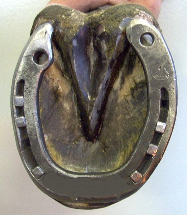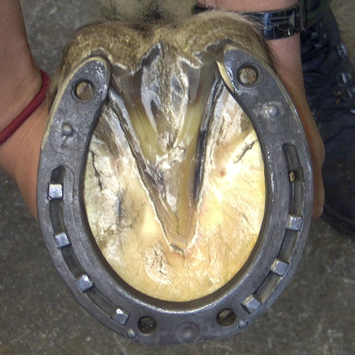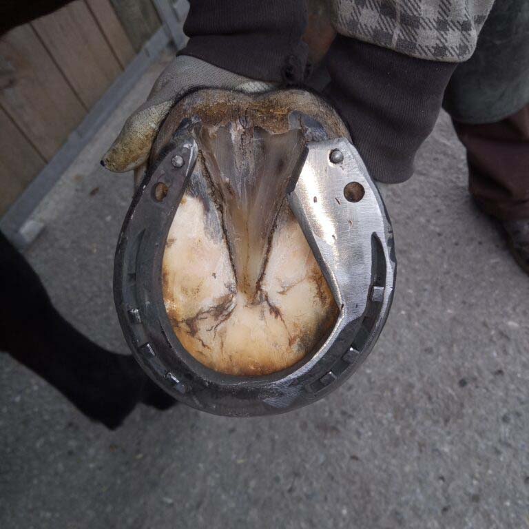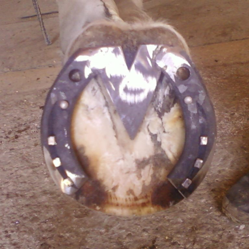 Bei diesem Beschlag wird der Strahl mit einbezogen, d.h. der Steg wird über dem Strahl angepasst so dass der Strahl auch einen Teil der von oben herab wirkenden Kräfte aufnimmt und somit die Trachten entlastet, damit diese mit weniger Druck nachwachsen können. Doch sollte dieser Beschlag nicht allzu oft verwendet werden, da sich der Strahl deformieren kann. Da ein solcher Beschlag im Stall hergestellt wird, ist auch dies mit unseren topausgerüsteten mobilen Schmieden kein Problem.