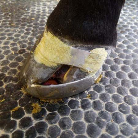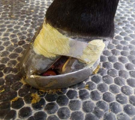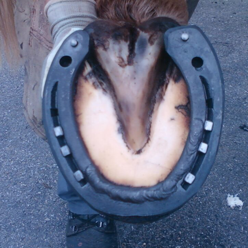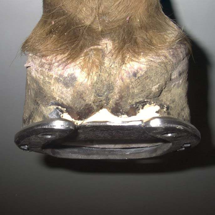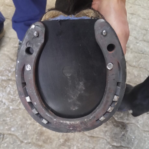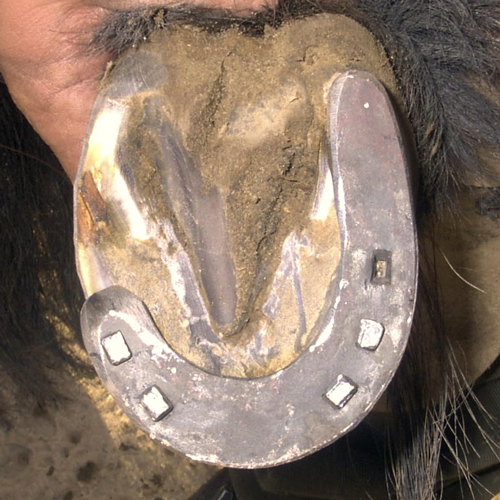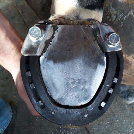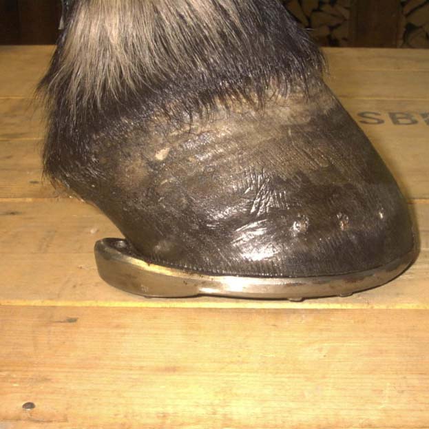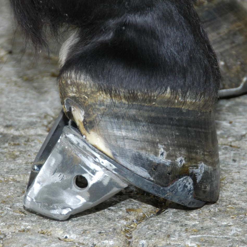 Zehenkappe am Pferd das schleift Dieses Hufeisen mit extrem grosser Zehenklappe wurde für Pferde mit akutem Spat verwendet.