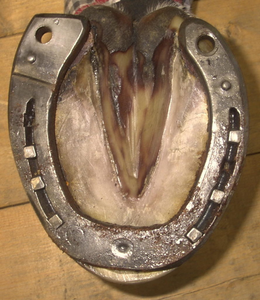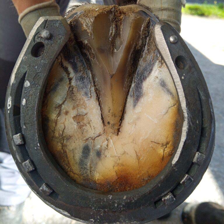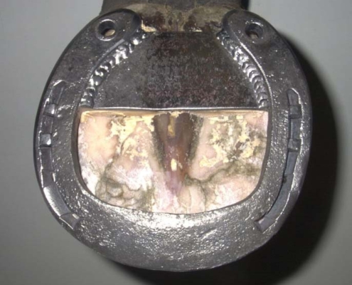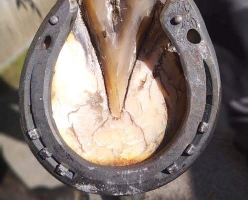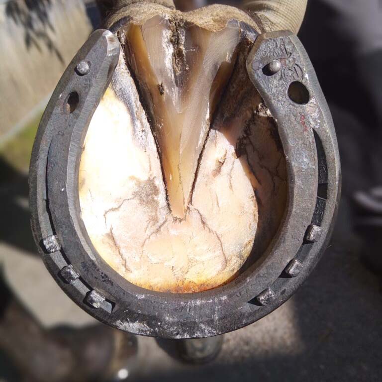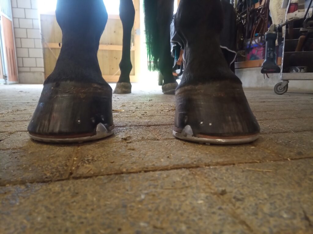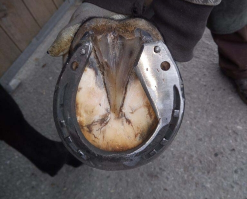 Strahlfäule… ein immer aktuelles Thema bei den Pferdebesitzern. Wichtig ist, dass beim Ausschneiden alle verfaulten und zersetzten Strahlteile weggeschnitten werden, damit die gesunden Partien nicht weiter verfaulen können. Wir legen auch grossen Wert darauf, dass kein Blut rinnt, wobei dies bei dem stark durchbluteten und dazu noch erkrankten Strahl nicht immer einfach ist. Auch muss ein Pferd direkt nach dem Beschlag behandelt werden. Dazu führen wir verschiedene Produkte mit.