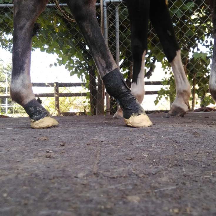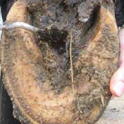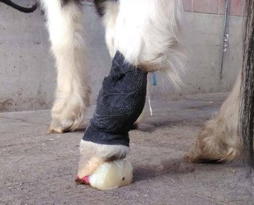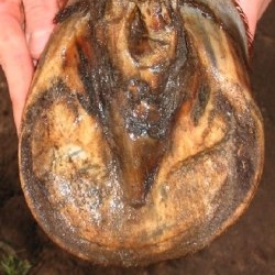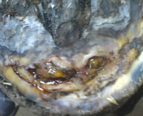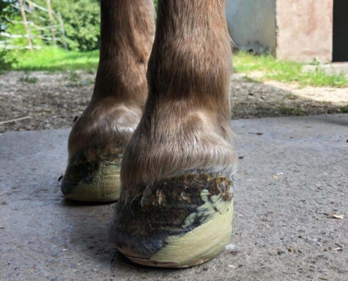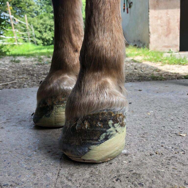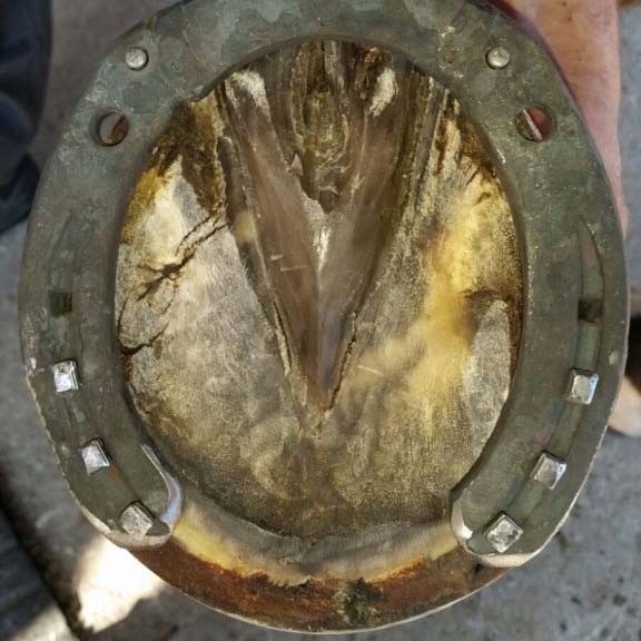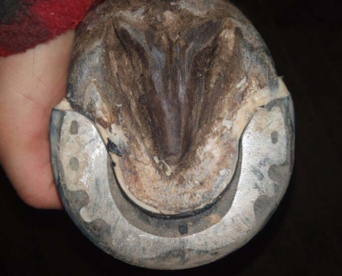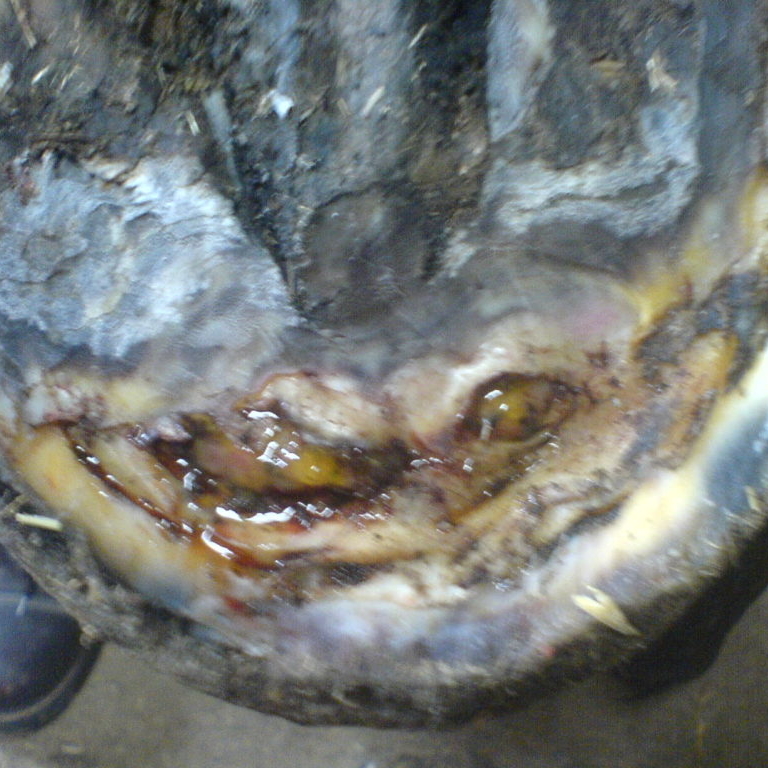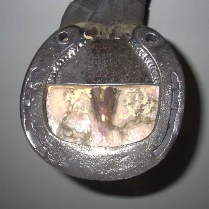 Strahlfäule… ein immer aktuelles Thema bei den Pferdebesitzern. Wichtig ist, dass beim Ausschneiden alle verfaulten und zersetzten Strahlteile weggeschnitten werden, damit die gesunden Partien nicht weiter verfaulen können. Wir legen auch grossen Wert darauf, dass kein Blut rinnt, wobei dies bei dem stark durchbluteten und dazu noch erkrankten Strahl nicht immer einfach ist. Auch muss ein Pferd direkt nach dem Beschlag behandelt werden. Dazu führen wir verschiedene Produkte mit.
