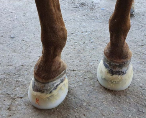 Bei dieser Krankheit, welche vorwiegend an den Vorderhufen, selten auch an den Hinterhufen auftreten kann, ist es wichtig, dass das Pferd möglichst schnell vom Tierarzt behandelt wird. Hier ist es wichtig, dass Tierarzt und Hufschmied zusammen den für das Pferd geeigneten Beschlag definieren. Heute wird anhand von Röntgenbildern entschieden, wie der Beschlag auszusehen hat. Dieser Entscheid hängt von der Rotation oder Absenkung des Hufbeins ab. Ein frühes Erkennen dieser Krankheit ist entscheidend. Zunehmend wird heute geklebt, um das gehen der Pferde zu unterstützen.