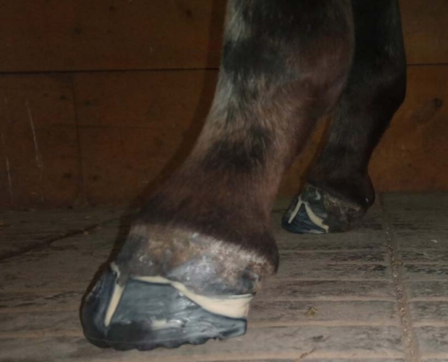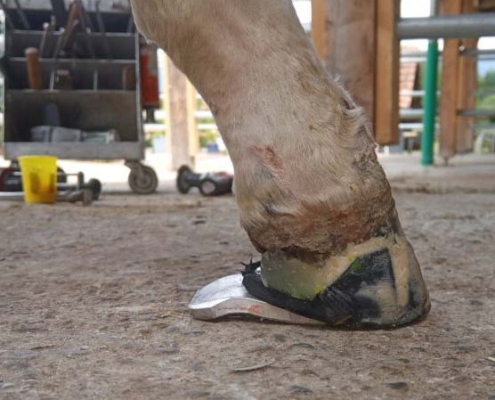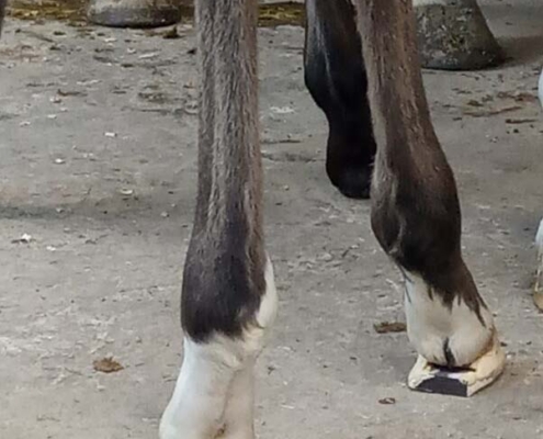 Das Bügelhufeisen ist eine Möglichkeit um die Kurbengallen zu therapieren. Wie man auf dem Bild erkennen kann, hat das Pferd extreme Gallen. Durch die Überbelastung des Sprunggelenkes wurde der Schleimbeutel gereizt und dadurch ist die Kurbengalle entstanden. Mit dem Bügel-Hufeisen entlastet man die Beugesehnen, so dass sich der darunter liegende Schleimbeutel erholen kann. Der doch etwas ungewöhnliche orthopädische Bügeleisen-Beschlag wird regelmässig tiefer gestellt.