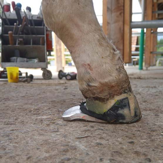 Wie das Wort bereits sagt, schleift das Pferd meistens die Hinterhufe am Boden nach. Hier kann, bei nicht allzu schlimmen Fällen, ein leichtes Anheben der Schusskante des Hufeisens gute Abhilfe leisten. Dies bewirkt ein schnelleres Abtreten. In sehr schlimmen Fällen, muss an der Schusskante des Hufeisen eine zusätzliche Kappe angeschweisst werden, damit das Pferd zuerst die Kappe abschleifen muss bevor es den Huf abnützt. Mit unserer Schweissanlage in den Fahrzeugen können wir dieses Spezialhufeisen vor Ort anfertigen